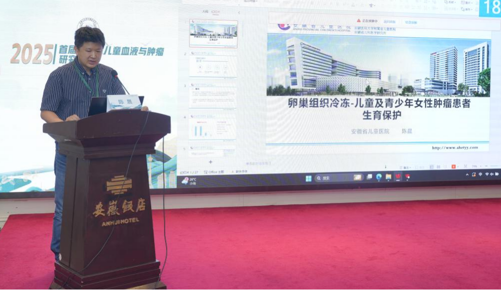 在本次大会上,安徽医科大学第一附属医院生育力保存团队的合作专家成员——安徽省儿童医院肿瘤外科陈晨教授,以《卵巢组织冷冻——儿童及青少年女性肿瘤患者的生育力保护》为题进行专题授课,分享了他与我院团队在肿瘤患者生育力保存领域的最新进展与实践经验。